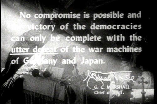 A lot of the connecting material, the maps and animation which show, for example, weak Polish units being surrounded and destroyed by superior Nazi forces like healthy cells being destroyed by predatory bacilli, were produced by the Walt Disney Studios under a general contract by which the government got Hollywood services at cost. (When I worked for Disney in the 1970s, I’d regularly ask Disney archivist Dave Smith if I could screen some of this out‐of‐release material, especially Victory thru Airpower which projected the forthcoming B‐29 campaign in the Pacific with awesome animation. Dave would shake his head and say, “…we don’t want to give rise to bad feelings against people who are no longer our enemies…”)