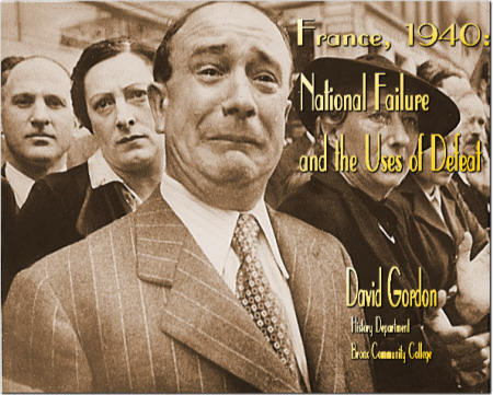York Section) Victory in war is universally desired, but defeat also has its uses. This is especially true if one believes the aim of politics is not merely to win elections, but also to drive one’s opponents from political life. In that case, defeat can be more useful than victory. Victories unite nations. Even opposition politicians can usually claim a share of the glory. Defeats frequently divide people, and the blame that inevitably accompanies defeat can be skillfully used to irremediably discredit rivals. Some opposition politicians will always find the destruction of domestic political enemies more satisfying than the defeat of any foreign foe. For these, military defeat, if not sought, will always be welcome. My talk will examine three themes. The first is the way that explanations of the 1940 French defeat were used to gain political advantage. This would result in the creation of many myths. The second is a brief examination of the purely strategic and tactical deficiencies that led to the rapid French collapse. The third is a discussion of the broader and overarching failure of French governments, and the French nation, to meet the German threat when it was still able to do so. Both the military errors of 1940, and the larger problem of lethal French passivity in the decade before the war, were ignored by the mythmakers of post 1940 France. The reasons for this are obvious. A purely military failure could not be blamed on any political group. Criticism of the failure of will to act against Germany in the decade before the war indicted too many, and was therefore equally useless. Truth is frequently the first victim in the pursuit of political advantage. The uses of defeat had already been demonstrated well before the Second World War. The Second Empire had been destroyed, and the Third Republic born, in the midst of France’s 1870 defeat by Prussia. The effects of the First World War had been more dramatic. None of the governments of the defeated Central Powers had survived. Military collapse had allowed revolutionary leaders who could never have succeeded under other circumstances to seize power. The defeat of France in 1940 would have a similar result. But for some supporters of the new Vichy State, the destruction of the Third Republic was not enough They also had to destroy the reputations of their erstwhile republican opponents. This they believed would enhance the legitimacy of the new regime. It would also provide a long awaited revenge. This of course did not stop defeated republicans from blaming their Vichy rivals for the defeat. They too were already creating their own myths, which they hoped would provide future advantage. Certainly, the collapse of France in six weeks was the greatest surprise of the war. The nation had been expected by almost everyone to hold out against the Germans for years. The ability to do so had been presumed by France’s defensive strategy. Few could believe that the rapid collapse of a large, well equipped army was the result of military incompetence. Some socialists and Communists were quick to assume that the generals, disillusioned by the 1936 Popular Front government, had betrayed the Republic. Others, seeking more ideologically satisfying explanations, blamed capitalism, clericalism, and the “two hundred families“ that had figured so large in French Marxist mythology in the 1930s. (The two hundred families referred to the largest share holders of the Banque de France, who alone had voting rights, and who were therefore assumed prior to 1936 to dictate French monetary policy. They were synonymous with the most powerful industrial and financial interests in the country.) For those newly triumphant at Vichy, the causes of defeat were equally obvious. Anti‐clericalism, parliamentary corruption and the Marxist parties that had divided the nation were to blame. It is possible to sympathize with those who wanted to find deeper causes for the catastrophe that at first seemed to have determined the future of France. It is also understandable that political leaders would seek political advantage. However, all the explanations about fundamental weaknesses causing the collapse were greatly exaggerated. France had not gone to war divided. The anger created by Popular Front reforms had largely been submerged in 1940 by a grim determination to win the war. Marcel Déat’s subversive question, “Why Die for Danzig?” had ultimately had little effect. Nor was France betrayed. As recent literature on the war demonstrates, France was defeated because her generals had made serious mistakes during the campaign. Robert Doughty put it best when he wrote that the Germans “outfought the French tactically and outsmarted them strategically.“ They had also had an inordinate amount of luck. France instead had been a victim of its own military doctrine. The French